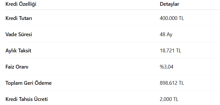 Hem sıfır kilometre hem de ikinci el araç alımlarında kullanılabilen kredi, %3,04 faiz oranı ve 48 aya varan vade seçenekleriyle dikkat çekiyor.